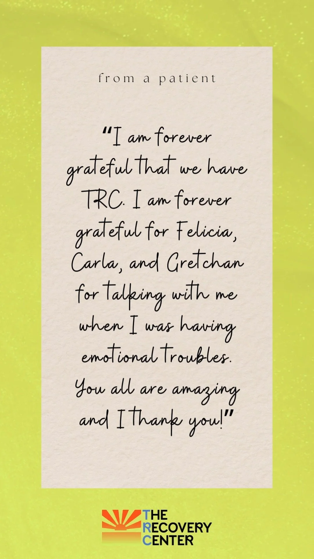 For the safety and security of our patients, we do not allow visitors during their 7 day stay here at TRC.